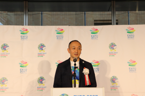 イベントは、主催者を代表し、2027年国際園芸博覧会マスターライセンスオフィスの西村宣浩代表業務執行者による挨拶からスタートしました。西村代表業務執行者は、今回のコラボレーションの意義と、オフィシャルストアの今後の展望について「初めての民間キャラクターとのコラボレーションとして、世界中に多くのファンを持つサンリオ様との取り組みを実施いたしました。今回のコラボレーションを通じて、これまでEXPO 2027に関心のなかった方々にも関心を寄せていただければと考えております。今後は各地域の伝統工芸品などとのコラボレーションも積極的に展開し、EXPO 2027の機運をさらに高めてまいります。」と述べました。
